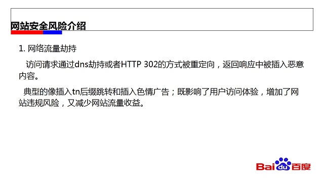 网站安全的第一个风险是网络流量的劫持,举个case,一家做鲜花的电商,本来在百度的订单转化非常好。结果最近发现,用户在打开网站的时候,里面插入了尺度比较大的色情广告,导致网站转化率非常低。用户做测试发现是被劫持了,被劫持之后我们给站点方案和指导,后面劫持的现象就消失了。网络流量劫持非常普遍,站点流量损失有20%左右,对站长带来的伤害非常大。
